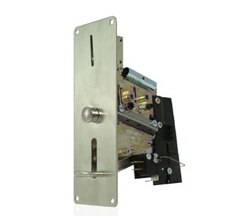 Selector / aceptador de acero inoxidable para fichas rmetálicas, con ranura y botón de devolución para fichas defectuosas, ideal para instalar en temporizadores Paymatic, de fácil colocación, viene con microswitch sensor de fichas de 27,0 x 1,95mm.